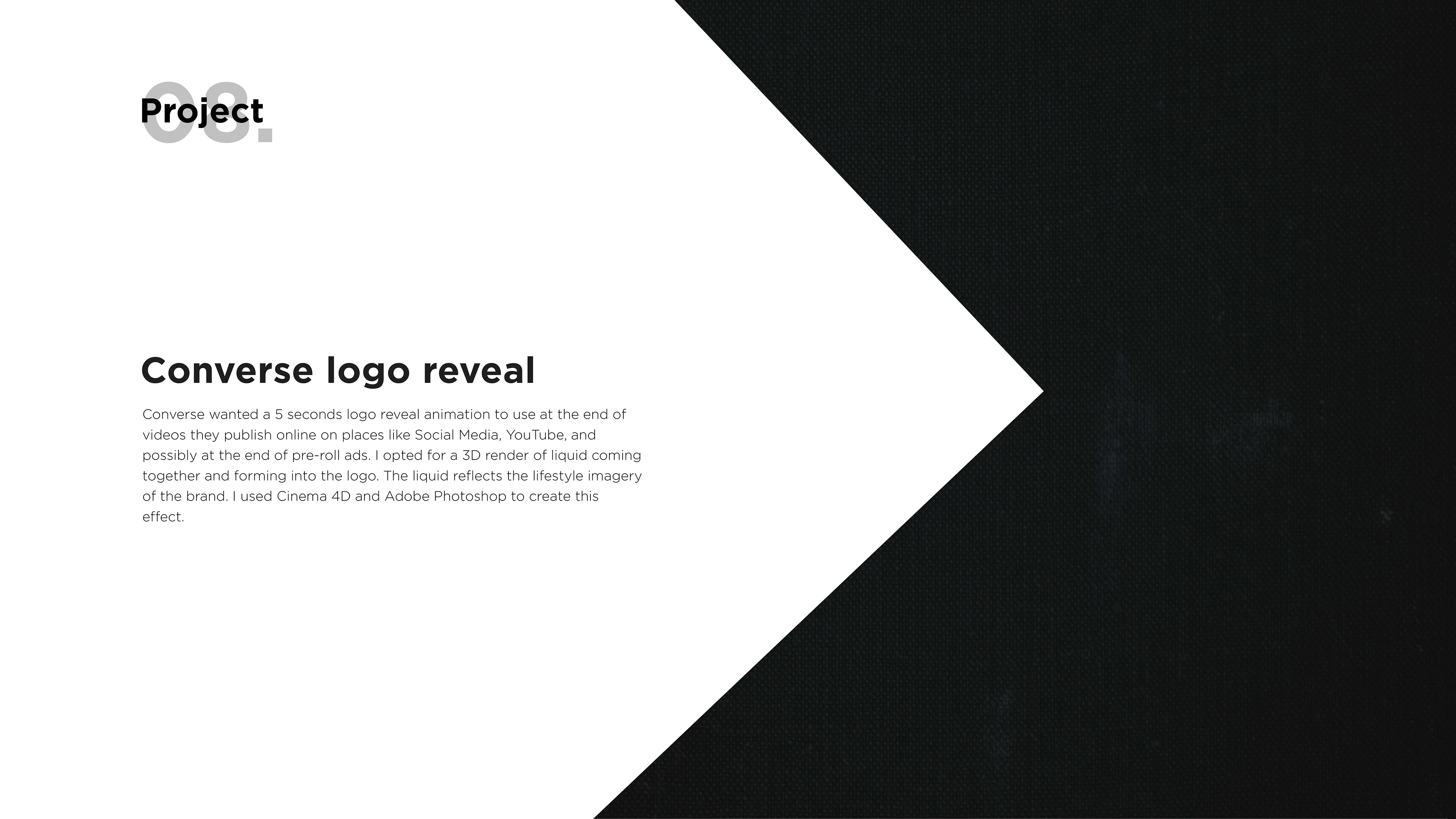 Jag tog en Bootcamp i design mentorerad av Michael Frederick. Det finns 10 projekt som visas i denna presentation. Vi fick en ny brief att arbeta med varje vecka och behövde presentera vår design för återkoppling. Projekten sträcker sig från annonser, stilramar, övergångar och titelkort. Arbetet är spekulativt, men brieferna skrevs med verkliga scenarier och tidsgränser.